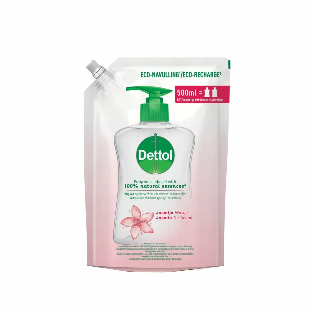 Dettol Antibacteriële Handzeep – Navulling 500 ml – JasmijnMet de heerlijke frisse kalmerende geur van JasmijnVerzorgt de handenHelpt de verspreiding van bacteriën tegen te gaanDermatologisch getestVerwijdert hardnekkig vuil, maar voelt zacht aan voor de huidZacht voor de huid, hard tegen vuil. Dettol handzeep met Jasmijn voor een aangename geur en verzorgende werking van de handen. Eindelijk, de verzorging en bescherming die je familie verdient en die helpt om uw handen gezond te houd