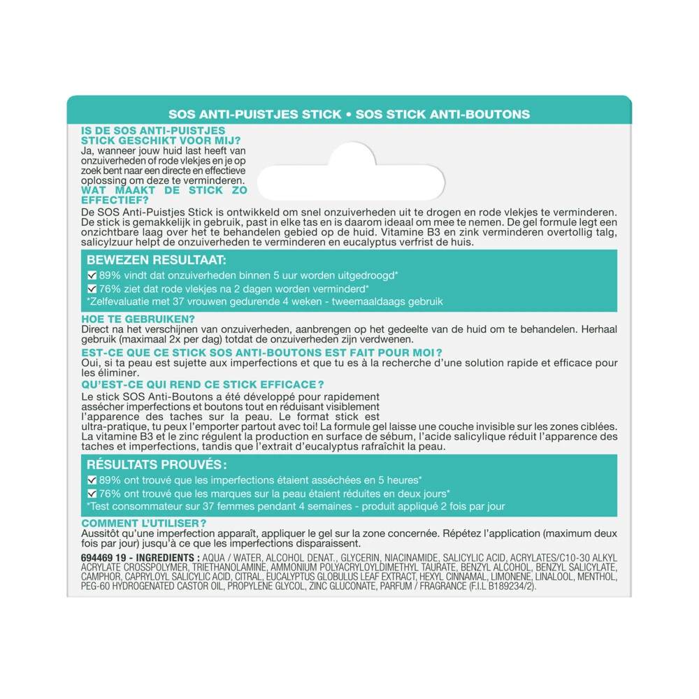 Garnier SkinActive Face SOS Anti-Puistjes Stick – Tegen puistjes, onzuiverheden en rode vlekjesHeeft jouw huid last van puistjes, mee-eters, rode vlekjes of andere onzuiverheden? De SOS Anti-Puistjes Stick van Garnier Pure Active behandelt deze onzuiverheden direct en effectief. Dit nieuwe product van Garnier helpt tegen puistjes en is ontwikkeld om snel onzuiverheden uit te drogen en rode vlekjes te verminderen. De gel formule legt een onzichtbare laag over je huid, reinigt de huid en is geschi