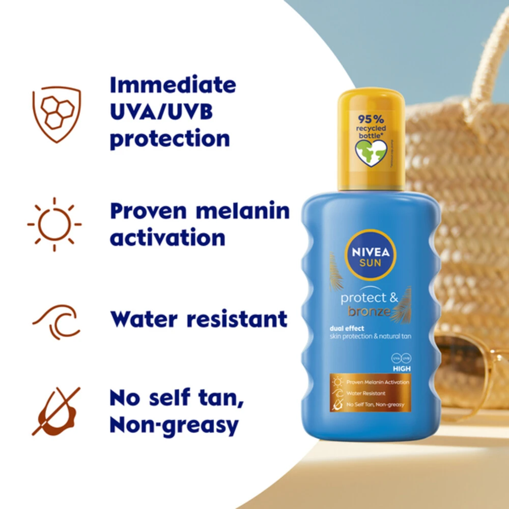 NIVEA SUN Protect & Bronze Zonnespray SPF 50Nivea Sun Protect & Bronze Spray SPF50 beschermt de huid onmiddellijk tegen UVA/UVB-stralen en zorgt voor een natuurlijke bruine kleur. Het natuurlijke pro-melanine extract stimuleert het huideigen bruiningsproces voor een mooie, egale bruine kleur zonder zelfbruiner. Gebruikt regelmatig om het bruiningsproces te bevorderen. De lichte, niet-vette formule is waterbestendig en heeft geen zelfbruiner. De formule respecteert de oceaan door vrij te